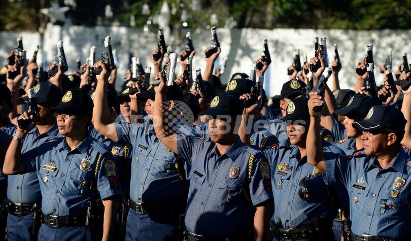 写真はマニラで銃口をテープでふさいだ銃をかかげる国家警察庁(PNP)の警察官ら(2012年12月29日撮影)。(c)AFP/NOEL CELIS