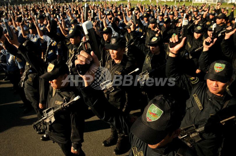 写真はマニラで銃口をテープでふさいだ銃をかかげる国家警察庁(PNP)の警察官ら(2012年12月29日撮影)。(c)AFP/NOEL CELIS