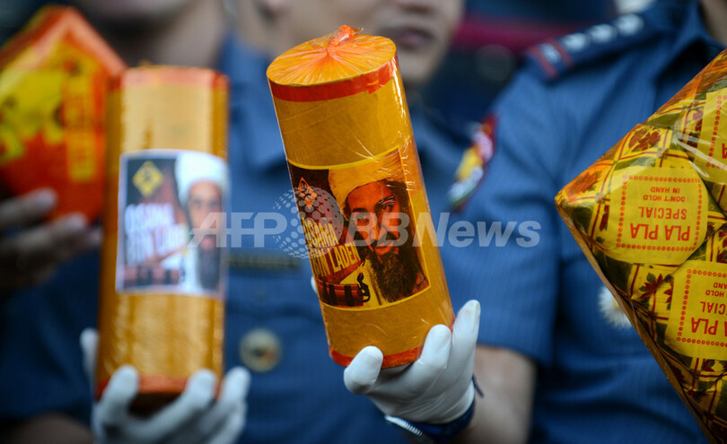 写真はマニラで押収された爆竹を公表する警察官。中には「ビンラディン」という名の爆竹もある(2012年12月29日撮影)。(c)AFP/NOEL CELIS