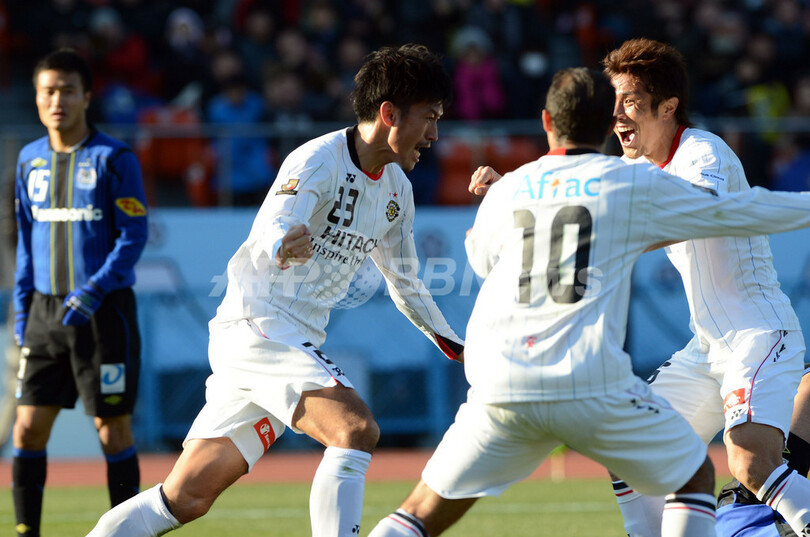 前半35分に先制点を挙げ、歓喜する柏レイソルの渡部博文(Hirofumi Watanabe、中央、2013年1月1日撮影)。(c)AFP/TOSHIFUMI KITAMURA