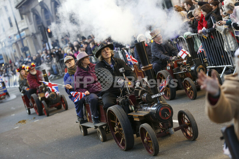 写真は、行進に参加する蒸気自動車の愛好家ら(2013年1月1日撮影)。(c)AFP/JUSTIN TALLIS