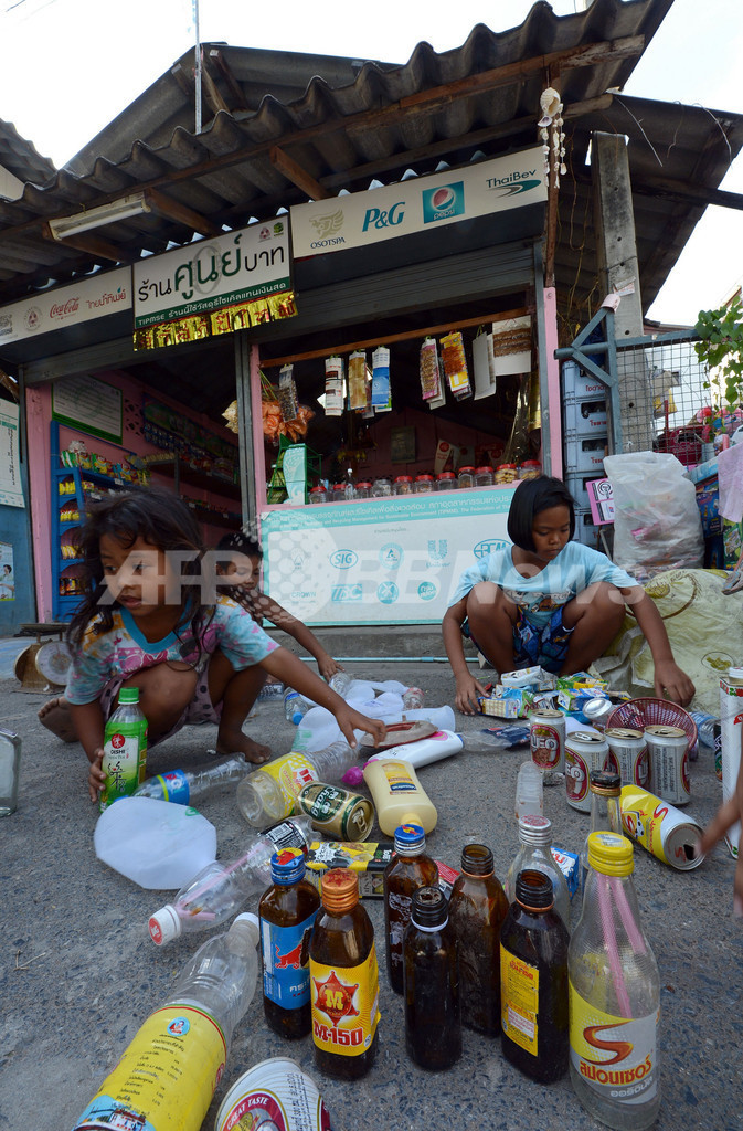 写真は、組合の店に売るための瓶や缶を選ぶ子供たち(2012年12月23日撮影)。(c)AFP/Pornchai KITTIWONGSAKUL
