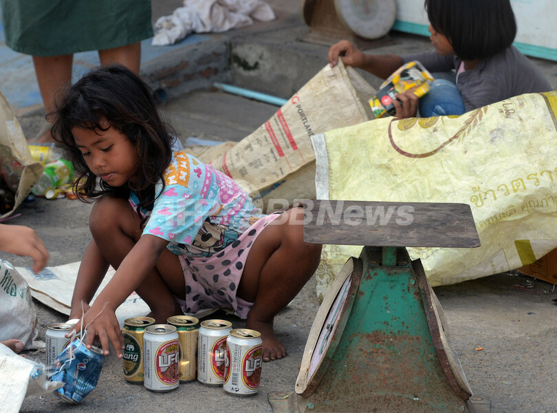 写真は、組合の店に売るための瓶や缶を選ぶ子供たち(2012年12月23日撮影)。(c)AFP/Pornchai KITTIWONGSAKUL