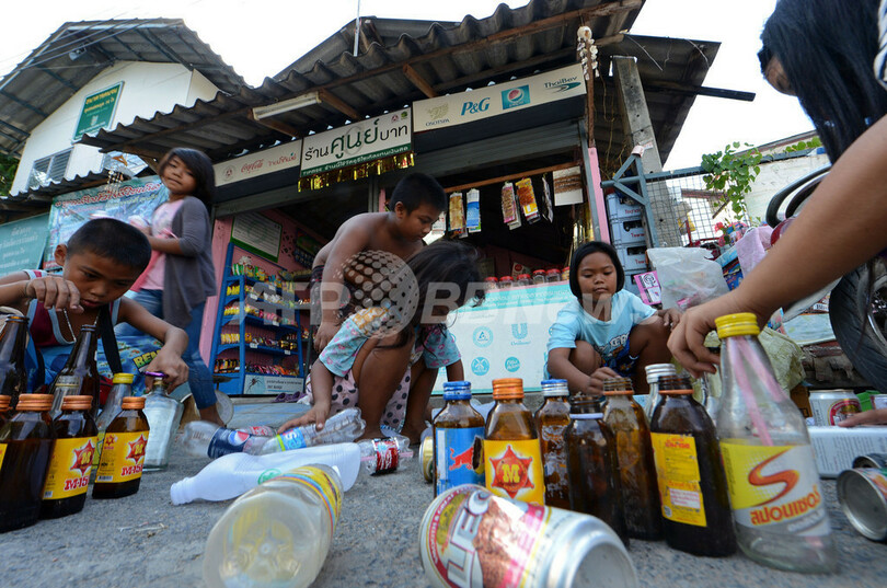 写真は、組合の店に売るための瓶や缶を選ぶ子供たち(2012年12月23日撮影)。(c)AFP/Pornchai KITTIWONGSAKUL