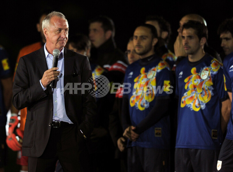 試合前にスピーチを行うカタルーニャ選抜のヨハン・クライフ(Johan Cruyff)監督(2013年1月2日撮影)。(c)AFP/LLUIS GENE