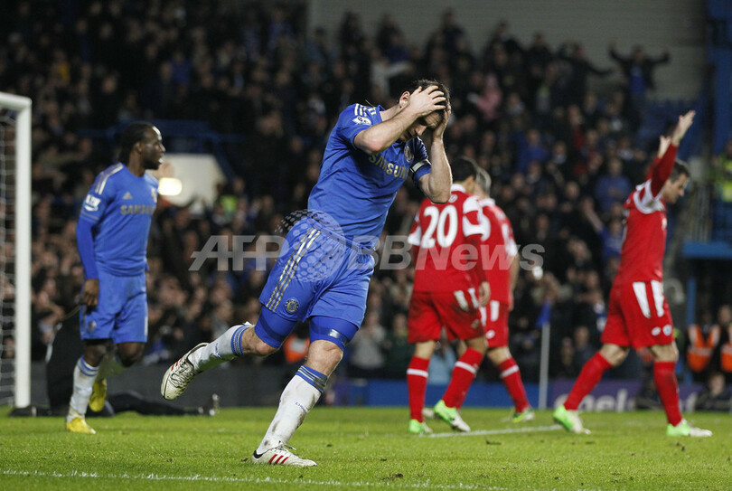 得点が認められず頭を抱えるチェルシーのフランク・ランパード(Frank Lampard、2013年1月2日撮影)。(c)AFP/GLYN KIRK