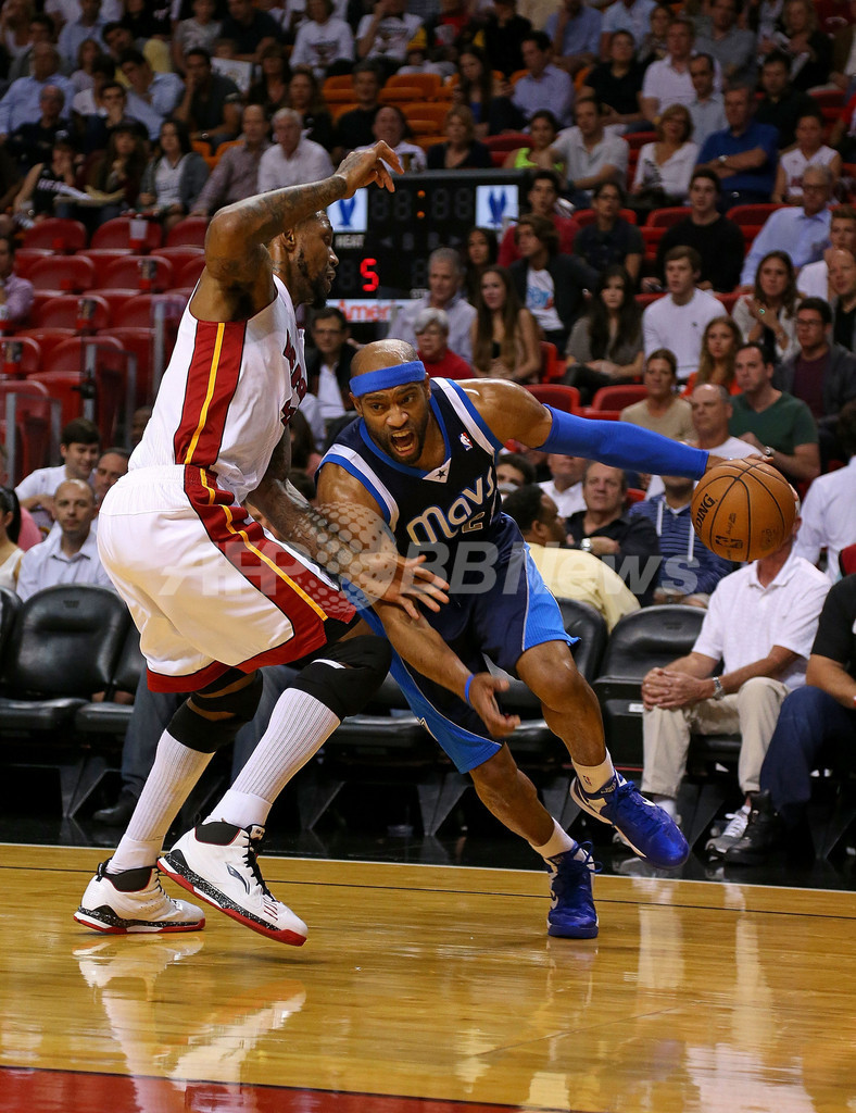 マイアミ・ヒートのウドニス・ハスレム(Udonis Haslem)にドライブを仕掛けるダラス・マーベリックスのビンス・カーター(Vince Carter、2013年1月2日撮影)。(c)AFP/Getty Images/Mike Ehrmann