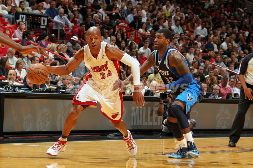 ダラス・マーベリックスのOJ・マヨ(O.J. Mayo、右)にドライブを仕掛けるマイアミ・ヒートのレイ・アレン(Ray Allen、2013年1月2日撮影)。(c)AFP/Getty Images/NBAE/Issac Baldizon