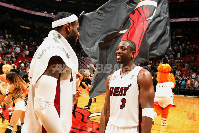 試合後、レブロン・ジェームズ(LeBron James、左)と喜びを分かち合うマイアミ・ヒートのドウェイン・ウェイド(Dwyane Wade、2013年1月2日撮影)。(c)AFP/Getty Images/Mike Ehrmann