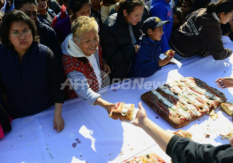 ニュース ライフ メキシコの公現祭、世界最大のパンが登場 2013年1月4日 21:15 発信地:メキシコシティ/メキシコ [ 中南米 メキシコ ] このニュースをシェア ‹ › ❮ 8/8 ❯ メキシコの首都メキシコ市(Mexico City)で3日、公現祭(Epiphany)を祝うイベントが行われ、外周1900メートル、重さ10トンの世界最大のリング状のパン「ロスカ・デ・レジェス(Rosca de Reyes)」がソカロ広場(Zocalo Square)に集まった約20万人に配られた。写真は「ロスカ・デ・レジェス」をもらう人たち(2013年1月3日撮影)。(c)AFP/Alfredo ESTRELLA 画像作成中 ! 【1月4日 AFP】メキシコの首都メキシコ市(Mexico City)で3日、公現祭(Epiphany)を祝うイベントが行われ、外周1900メートル、重さ10トンの世界最大のリング状のパン「Rosca de Reyes」がソカロ広場(Zocalo Square)に集まった約20万人に配られた。(c)AFP ライフ 一覧へ> メディア・報道関係・法人の方向け 写真・動画 購入のお問合せ>