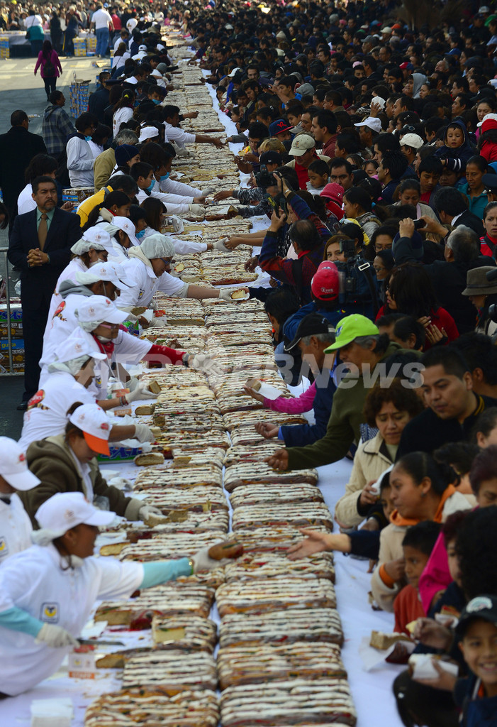 ニュース ライフ メキシコの公現祭、世界最大のパンが登場 2013年1月4日 21:15 発信地:メキシコシティ/メキシコ [ 中南米 メキシコ ] このニュースをシェア ‹ › ❮ 2/8 ❯ メキシコの首都メキシコ市(Mexico City)で3日、公現祭(Epiphany)を祝うイベントが行われ、外周1900メートル、重さ10トンの世界最大のリング状のパン「ロスカ・デ・レジェス(Rosca de Reyes)」がソカロ広場(Zocalo Square)に集まった約20万人に配られた。写真は「ロスカ・デ・レジェス」をもらう人たち(2013年1月3日撮影)。(c)AFP/Alfredo ESTRELLA 画像作成中 ! 【1月4日 AFP】メキシコの首都メキシコ市(Mexico City)で3日、公現祭(Epiphany)を祝うイベントが行われ、外周1900メートル、重さ10トンの世界最大のリング状のパン「Rosca de Reyes」がソカロ広場(Zocalo Square)に集まった約20万人に配られた。(c)AFP ライフ 一覧へ> メディア・報道関係・法人の方向け 写真・動画 購入のお問合せ>