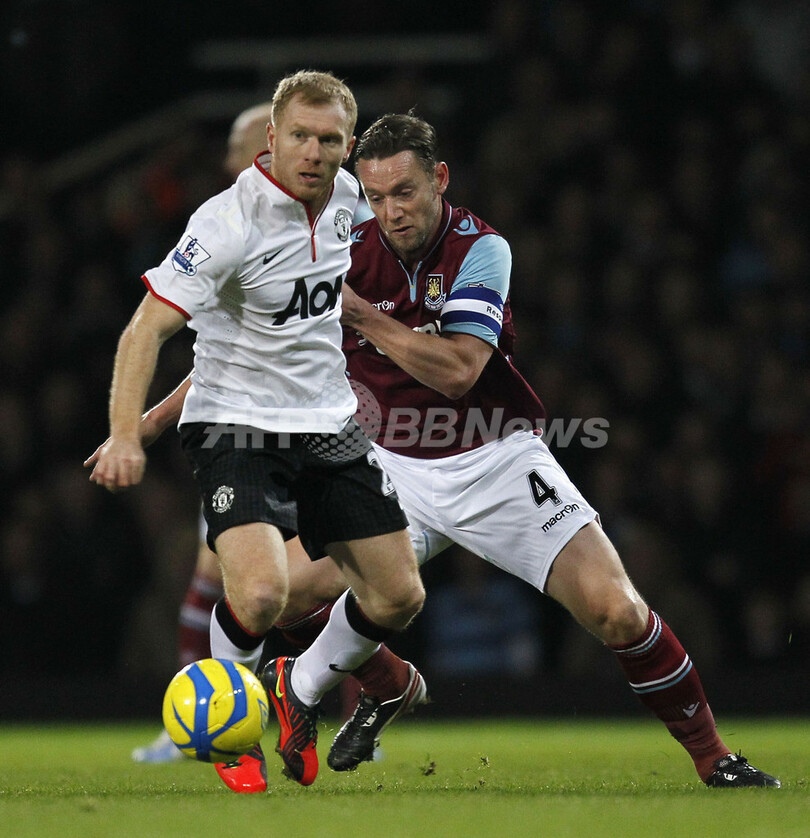 ウェストハムのケヴィン・ノーラン(Kevin Nolan、右)とボールを競るマンチェスター・ユナイテッドのポール・スコールズ(Paul Scholes、2013年1月5日撮影)。(c)AFP/IAN KINGTON