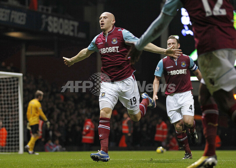 前半27分に同点ゴールを挙げ歓喜するウェストハムのジェームズ・コリンズ(James Collins、2013年1月5日撮影)。(c)AFP/IAN KINGTON