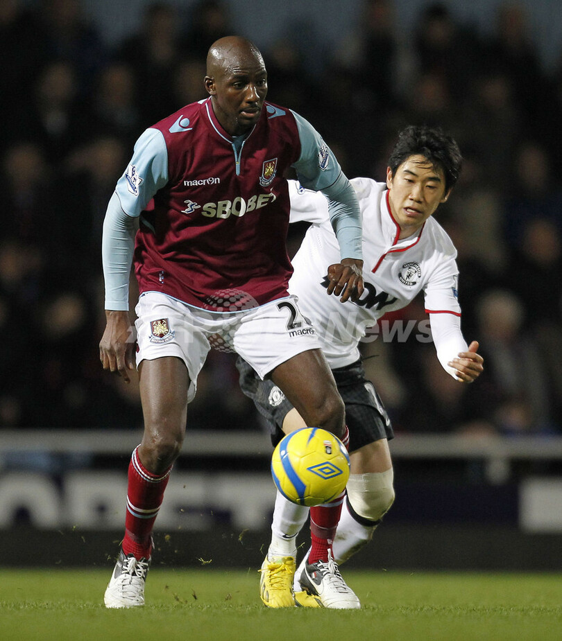 ウェストハムのアル・ディアッラ(Alou Diarra、手前)とボールを競るマンチェスター・ユナイテッドの香川真司(Shinji Kagawa、2013年1月5日撮影)。(c)AFP/IAN KINGTON
