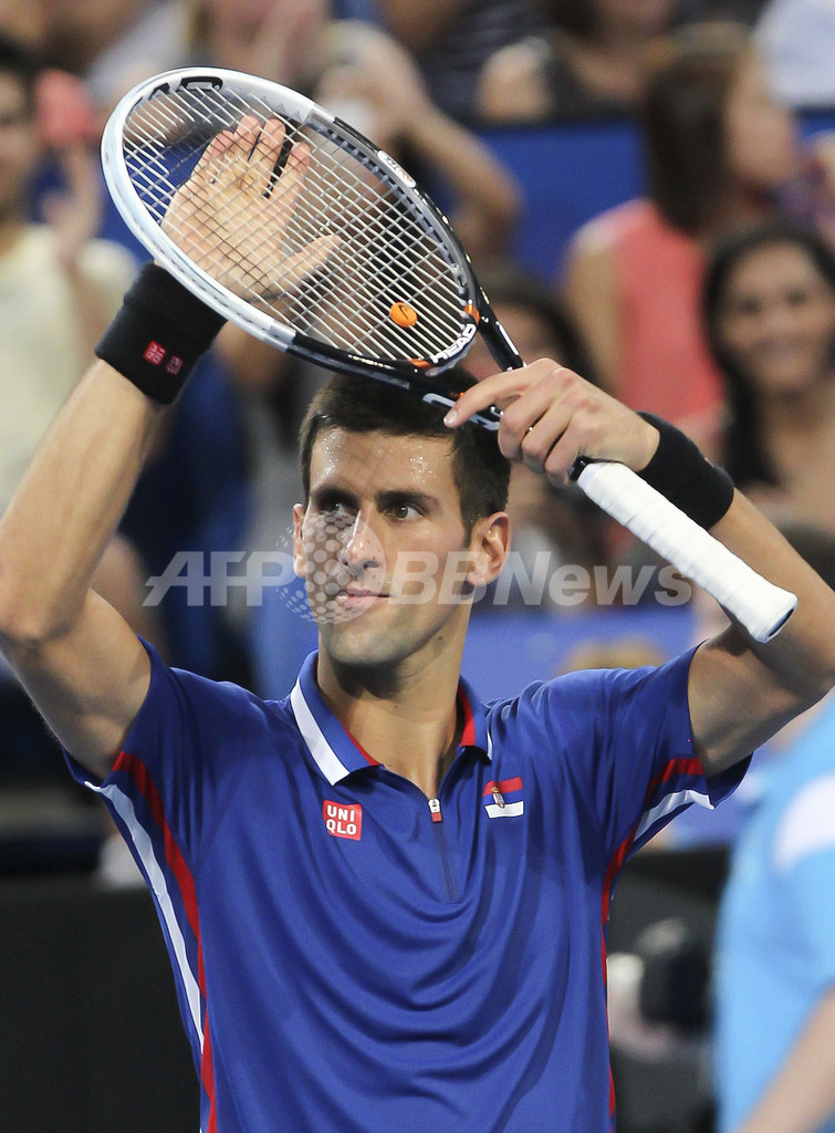 男子シングルスの試合に勝利し、歓声に応えるセルビアのノバク・ジョコビッチ(Novak Djokovic、2013年1月5日撮影)。(c)AFP/Tony ASHBY