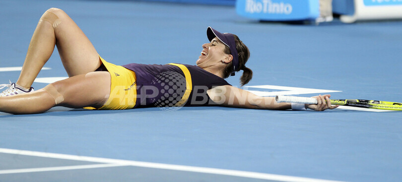 女子シングルスの試合で勝利を挙げ、コートに横たわって歓喜するスペインのアナベル・メディナ・ガリゲス(Anabel Medina Garrigues、2013年1月5日撮影)。(c)AFP/Tony ASHBY