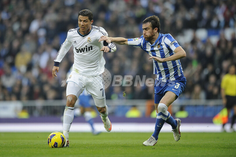 レアル・ソシエダのミケル・ゴンサレス(Mikel Gonzalez、右)とボールを競るレアル・マドリードのクリスティアーノ・ロナウド(Cristiano Ronaldo、2013年1月6日撮影)。(c)AFP/PEDRO ARMESTRE
