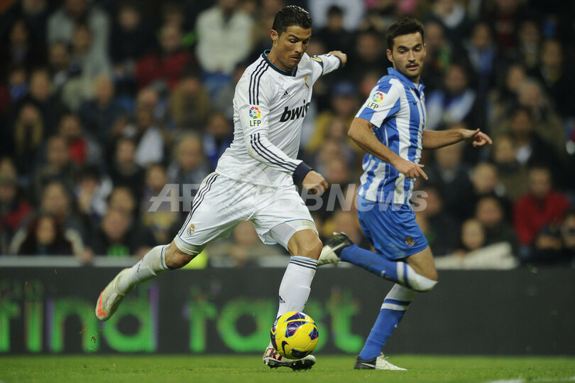 レアル・ソシエダのミケル・ゴンサレス(Mikel Gonzalez、右)とボールを競るレアル・マドリードのクリスティアーノ・ロナウド(Cristiano Ronaldo、2013年1月6日撮影)。(c)AFP/PEDRO ARMESTRE