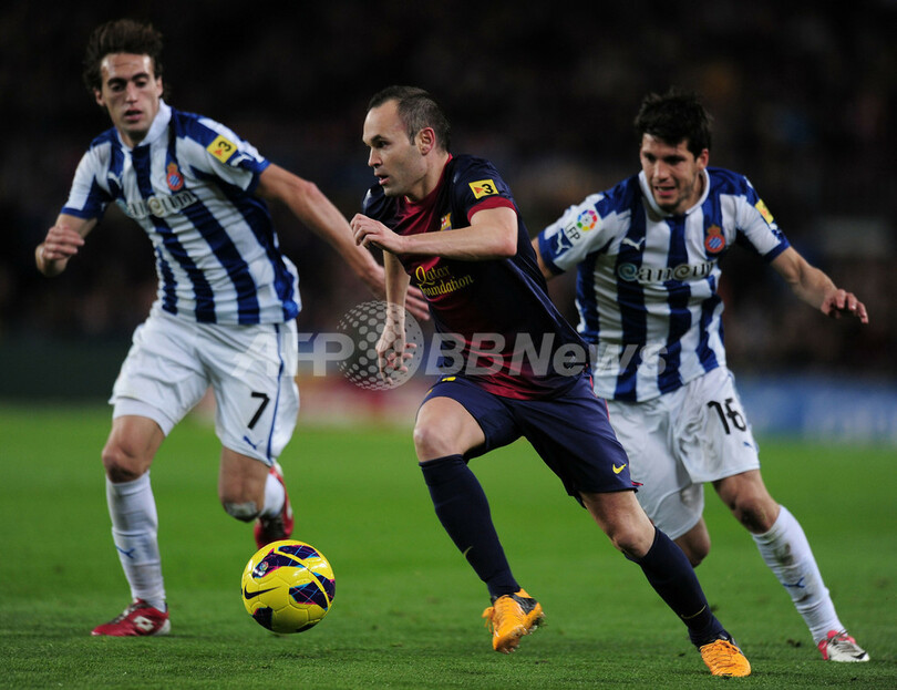エスパニョールのラウル・バエナ(Raul Baena、左)、ハビエル・ロペス(Javier Lopez、右)の前でボールをコントロールするFCバルセロナのアンドレス・イニエスタ(Andres Iniesta、2013年1月6日撮影)。(c)AFP/LLUIS GENE