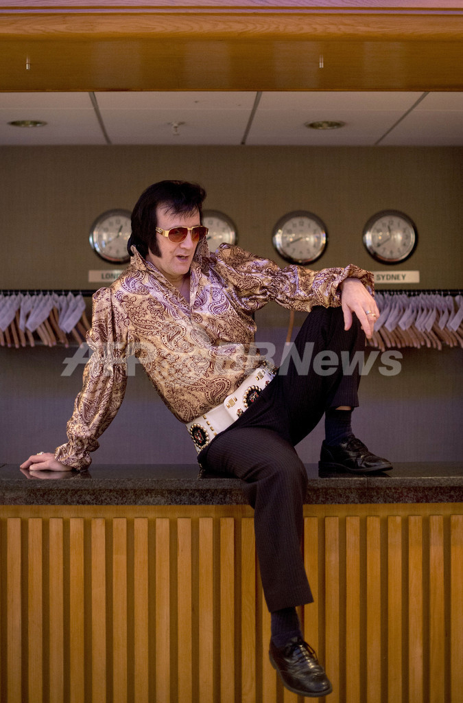 写真は、エルビスに扮(ふん)してポーズをするアーティスト(2013年1月6日撮影)。(c)AFP/BEN STANSALL