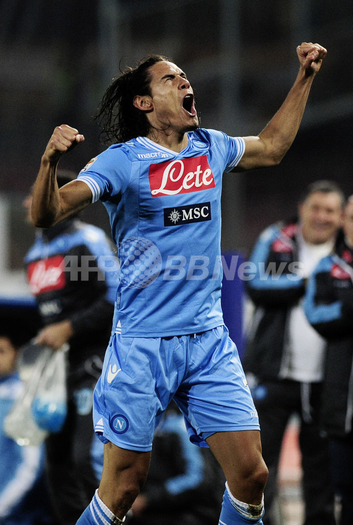 得点を決め歓喜するナポリのエディンソン・カヴァーニ(Edinson Cavani、2013年1月6日撮影)。(c)AFP/ROBERTO SALOMONE