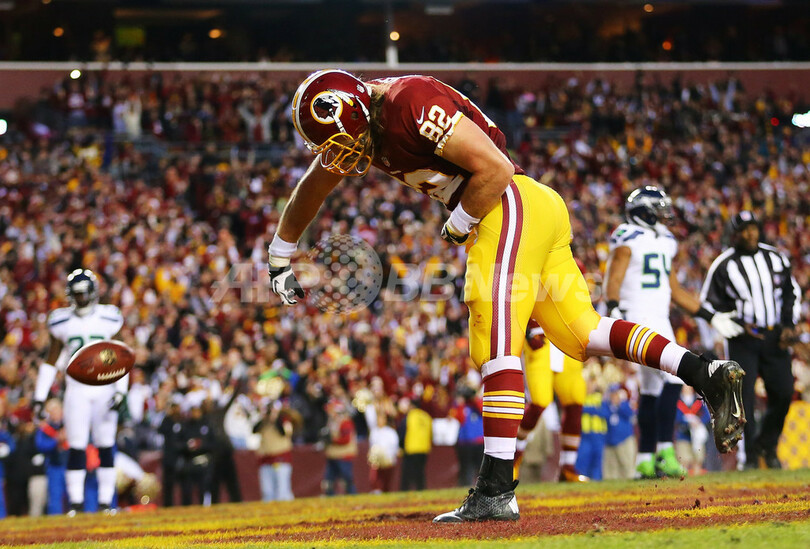 第1クォーターにタッチダウンを決め喜ぶワシントン・レッドスキンズのローガン・ポールセン(Logan Paulsen、2013年1月6日撮影)。(c)AFP/Getty Images/Al Bello