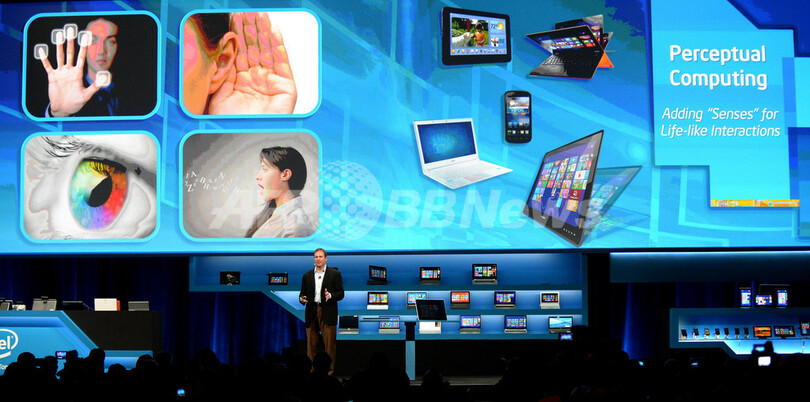 写真は最新技術の発表を行うインテル(Intel)のカーク・スカウゲン(Kirk Skaugen)副社長(2013年1月8日撮影)。(c)AFP/JOE KLAMAR