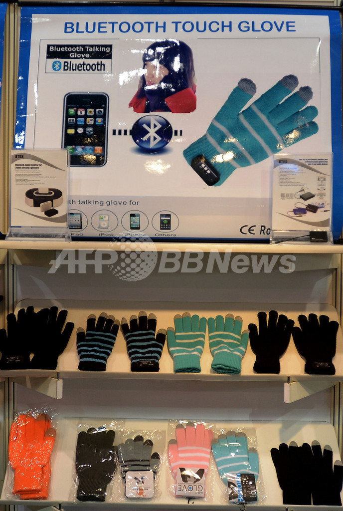 写真は台湾のMagic Protection Technologyのブースに展示された「ブルートゥース(Bluetooth)グローブ」(2013年1月8日撮影)。(c)AFP/JOE KLAMAR