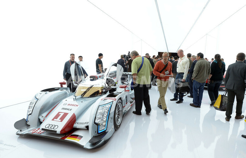 写真はアウディ(Audi)のレーシングカー「R18 e-tronクアトロ(R18 e-tron quattro)」を見る来場者たち(2013年1月8日撮影)。(c)AFP/JOE KLAMAR