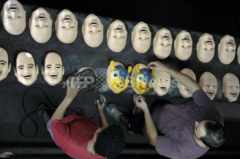 【1月10日 AFP】ブラジル・リオデジャネイロ(Rio de Janeiro)近郊のサンゴンサロ(Sao Gonçalo)の工場で作られるカーニバル用のお面。ずらりと並んだ面々は、同国のサッカー選手ネイマール(Neymar)やロナウジーニョ(Ronaldinho)、2014年サッカーW杯ブラジル大会のマスコットなど。世界的に有名なリオのカーニバルは、2月9日から12日まで開催される。(c)AFP