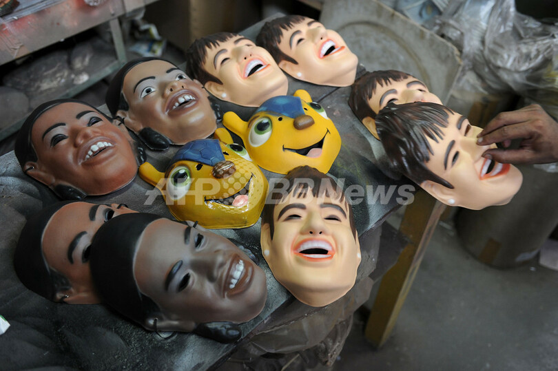 ブラジル・リオデジャネイロ(Rio de Janeiro)近郊のサンゴンサロ(Sao Gonçalo)の工場で作られるカーニバル用のお面。ずらりと並んだ面々は、同国のサッカー選手ネイマール(Neymar)やロナウジーニョ(Ronaldinho)、2014年サッカーW杯ブラジル大会のマスコットなど。世界的に有名なリオのカーニバルは、2月9日から12日まで開催される(2013年1月9日撮影)。(c)AFP/VANDERLEI ALMEIDA