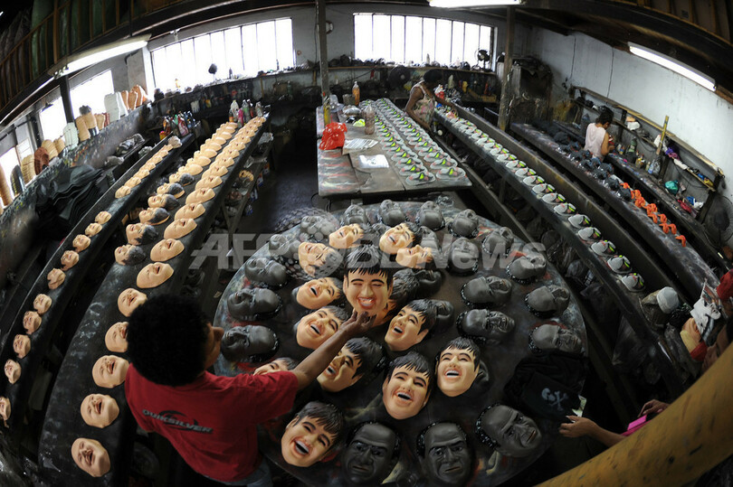 【1月10日 AFP】ブラジル・リオデジャネイロ(Rio de Janeiro)近郊のサンゴンサロ(Sao Gonçalo)の工場で作られるカーニバル用のお面。ずらりと並んだ面々は、同国のサッカー選手ネイマール(Neymar)やロナウジーニョ(Ronaldinho)、2014年サッカーW杯ブラジル大会のマスコットなど。世界的に有名なリオのカーニバルは、2月9日から12日まで開催される。(c)AFP