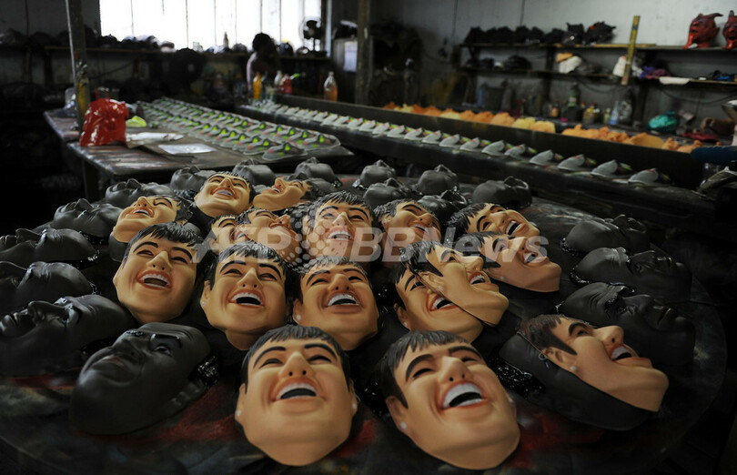 ブラジル・リオデジャネイロ(Rio de Janeiro)近郊のサンゴンサロ(Sao Gonçalo)の工場で作られるカーニバル用のお面。ずらりと並んだ面々は、同国のサッカー選手ネイマール(Neymar)やロナウジーニョ(Ronaldinho)、2014年サッカーW杯ブラジル大会のマスコットなど。世界的に有名なリオのカーニバルは、2月9日から12日まで開催される(2013年1月9日撮影)。(c)AFP/VANDERLEI ALMEIDA