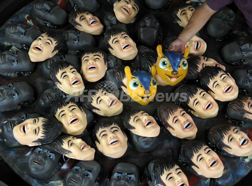 ブラジル・リオデジャネイロ(Rio de Janeiro)近郊のサンゴンサロ(Sao Gonçalo)の工場で作られるカーニバル用のお面。ずらりと並んだ面々は、同国のサッカー選手ネイマール(Neymar)やロナウジーニョ(Ronaldinho)、2014年サッカーW杯ブラジル大会のマスコットなど。世界的に有名なリオのカーニバルは、2月9日から12日まで開催される(2013年1月9日撮影)。(c)AFP/VANDERLEI ALMEIDA
