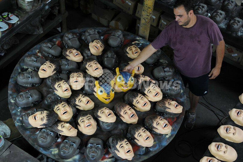 【1月10日 AFP】ブラジル・リオデジャネイロ(Rio de Janeiro)近郊のサンゴンサロ(Sao Gonçalo)の工場で作られるカーニバル用のお面。ずらりと並んだ面々は、同国のサッカー選手ネイマール(Neymar)やロナウジーニョ(Ronaldinho)、2014年サッカーW杯ブラジル大会のマスコットなど。世界的に有名なリオのカーニバルは、2月9日から12日まで開催される。(c)AFP