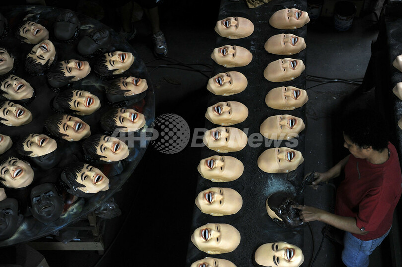 【1月10日 AFP】ブラジル・リオデジャネイロ(Rio de Janeiro)近郊のサンゴンサロ(Sao Gonçalo)の工場で作られるカーニバル用のお面。ずらりと並んだ面々は、同国のサッカー選手ネイマール(Neymar)やロナウジーニョ(Ronaldinho)、2014年サッカーW杯ブラジル大会のマスコットなど。世界的に有名なリオのカーニバルは、2月9日から12日まで開催される。(c)AFP