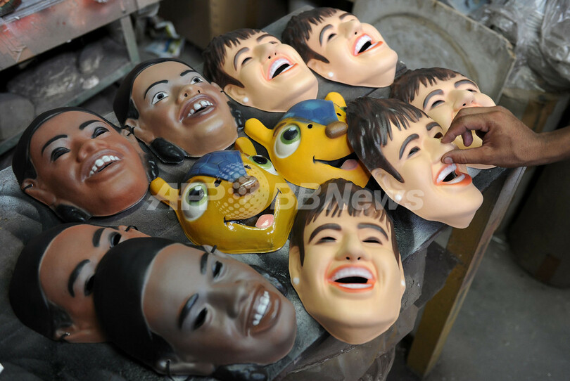 ブラジル・リオデジャネイロ(Rio de Janeiro)近郊のサンゴンサロ(Sao Gonçalo)の工場で作られるカーニバル用のお面。ずらりと並んだ面々は、同国のサッカー選手ネイマール(Neymar)やロナウジーニョ(Ronaldinho)、2014年サッカーW杯ブラジル大会のマスコットなど。世界的に有名なリオのカーニバルは、2月9日から12日まで開催される(2013年1月9日撮影)。(c)AFP/VANDERLEI ALMEIDA