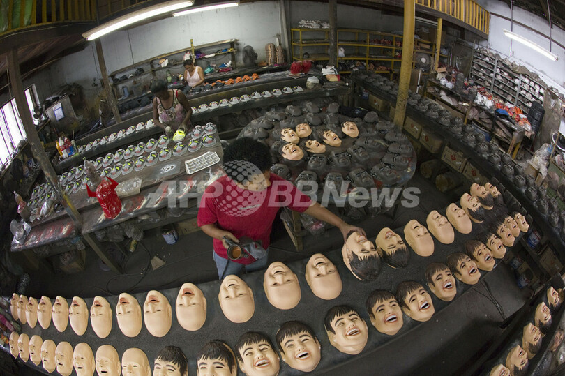 ブラジル・リオデジャネイロ(Rio de Janeiro)近郊のサンゴンサロ(Sao Gonçalo)の工場で作られるカーニバル用のお面。ずらりと並んだ面々は、同国のサッカー選手ネイマール(Neymar)やロナウジーニョ(Ronaldinho)、2014年サッカーW杯ブラジル大会のマスコットなど。世界的に有名なリオのカーニバルは、2月9日から12日まで開催される(2013年1月9日撮影)。(c)AFP/VANDERLEI ALMEIDA