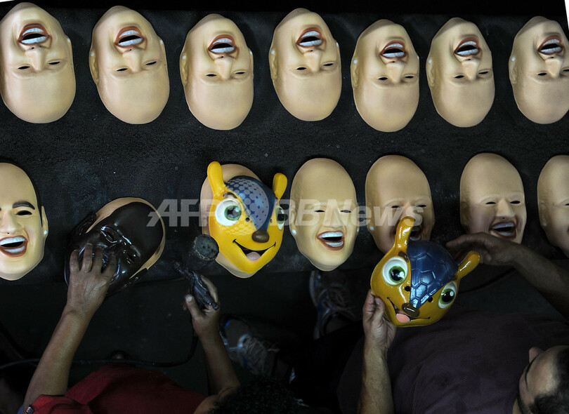 ブラジル・リオデジャネイロ(Rio de Janeiro)近郊のサンゴンサロ(Sao Gonçalo)の工場で作られるカーニバル用のお面。ずらりと並んだ面々は、同国のサッカー選手ネイマール(Neymar)やロナウジーニョ(Ronaldinho)、2014年サッカーW杯ブラジル大会のマスコットなど。世界的に有名なリオのカーニバルは、2月9日から12日まで開催される(2013年1月9日撮影)。(c)AFP/VANDERLEI ALMEIDA