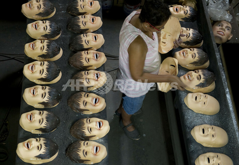 ブラジル・リオデジャネイロ(Rio de Janeiro)近郊のサンゴンサロ(Sao Gonçalo)の工場で作られるカーニバル用のお面。ずらりと並んだ面々は、同国のサッカー選手ネイマール(Neymar)やロナウジーニョ(Ronaldinho)、2014年サッカーW杯ブラジル大会のマスコットなど。世界的に有名なリオのカーニバルは、2月9日から12日まで開催される(2013年1月9日撮影)。(c)AFP/VANDERLEI ALMEIDA