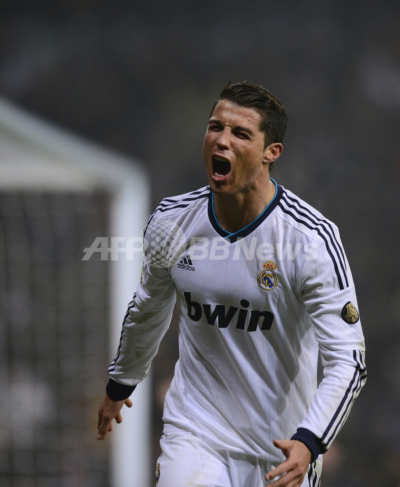 後半42分にハットトリックを達成し歓喜するレアル・マドリードのクリスティアーノ・ロナウド(Cristiano Ronaldo、2013年1月9日撮影)。(c)AFP/PIERRE-PHILIPPE MARCOU