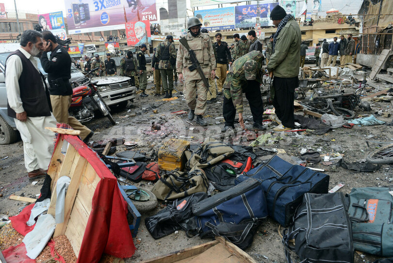 パキスタンで起きた攻撃としては、国際テロ組織アルカイダ(Al-Qaeda)の最高指導者だったウサマ・ビンラディン(Osama bin Laden)容疑者が殺害された直後の2011年5月13日に、北西部の町シャブカダル(Shabqadar)の治安警察の訓練施設前で起きた自爆犯2人による爆発で98人が死亡して以来の大惨事となった。(c)AFP/Maaz Khan