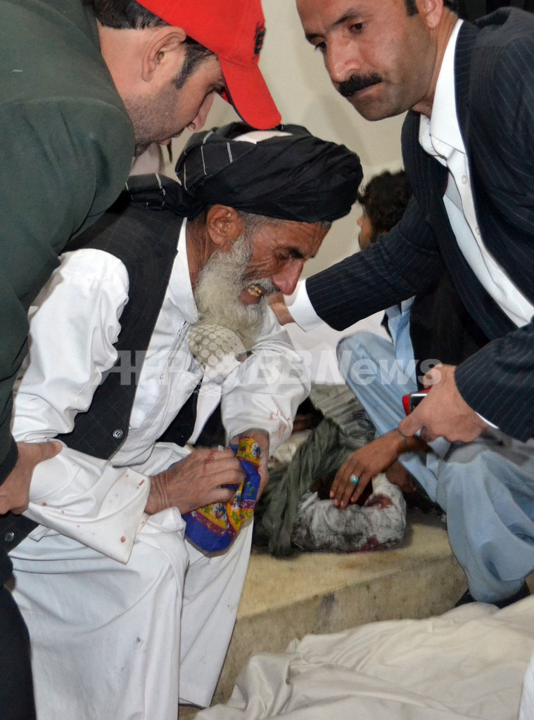 パキスタンで起きた攻撃としては、国際テロ組織アルカイダ(Al-Qaeda)の最高指導者だったウサマ・ビンラディン(Osama bin Laden)容疑者が殺害された直後の2011年5月13日に、北西部の町シャブカダル(Shabqadar)の治安警察の訓練施設前で起きた自爆犯2人による爆発で98人が死亡して以来の大惨事となった。(c)AFP/Maaz Khan