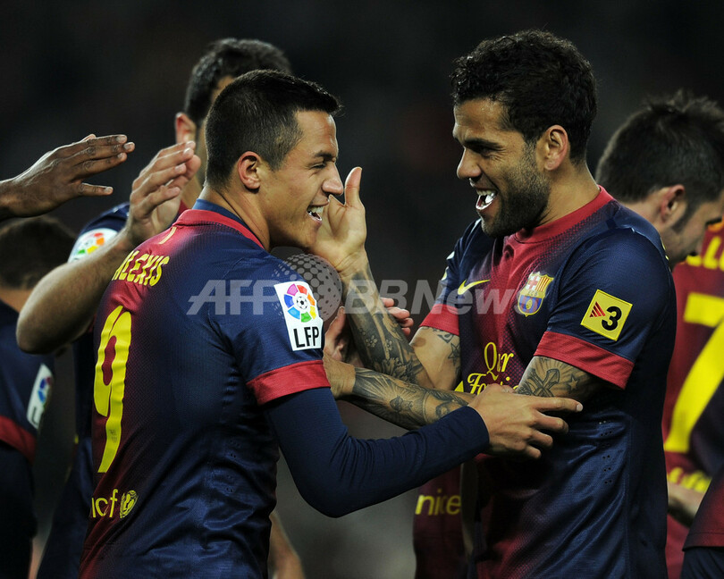 得点を挙げ、ダニエル・アルヴェス(Daniel Alves、右)らと喜ぶFCバルセロナのアレクシス・サンチェス(Alexis Sanchez、2013年1月10日撮影)。(c)AFP/LLUIS GENE