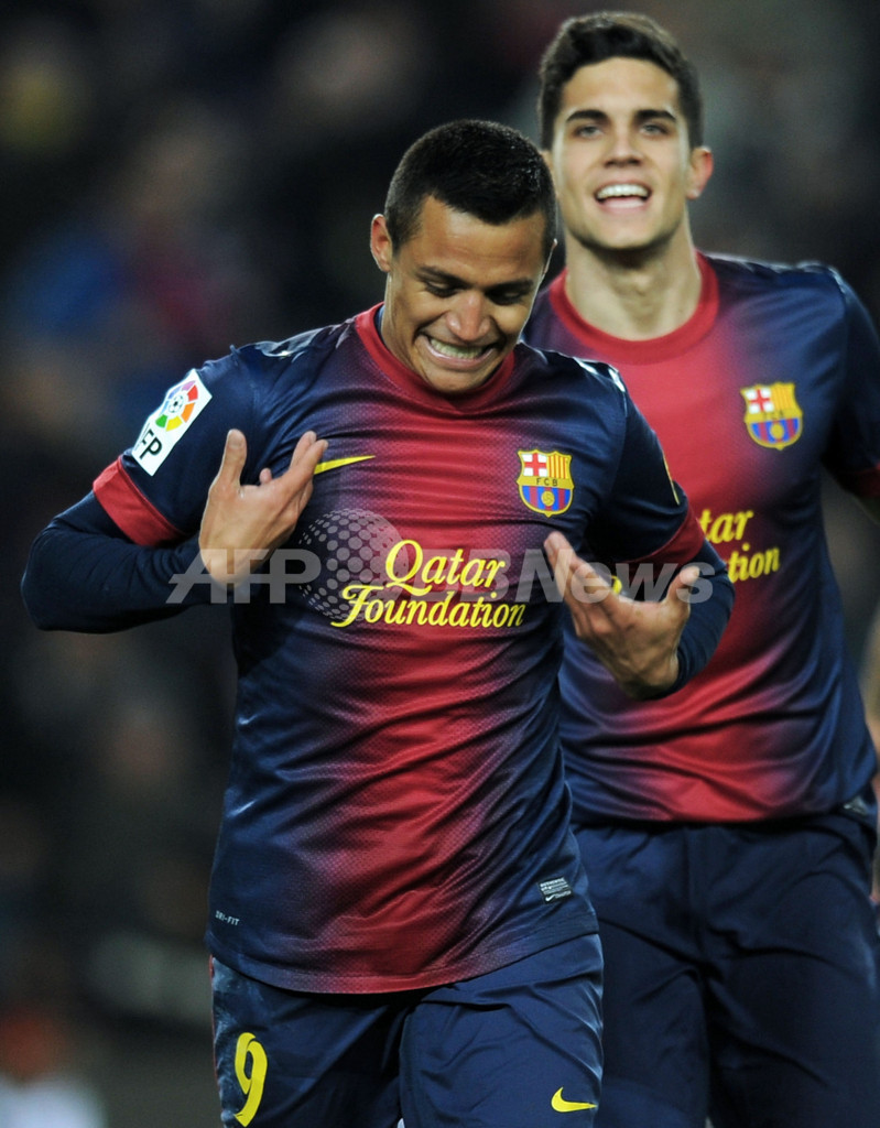 得点を挙げ歓喜するFCバルセロナのアレクシス・サンチェス(Alexis Sanchez、2013年1月10日撮影)。(c)AFP/LLUIS GENE