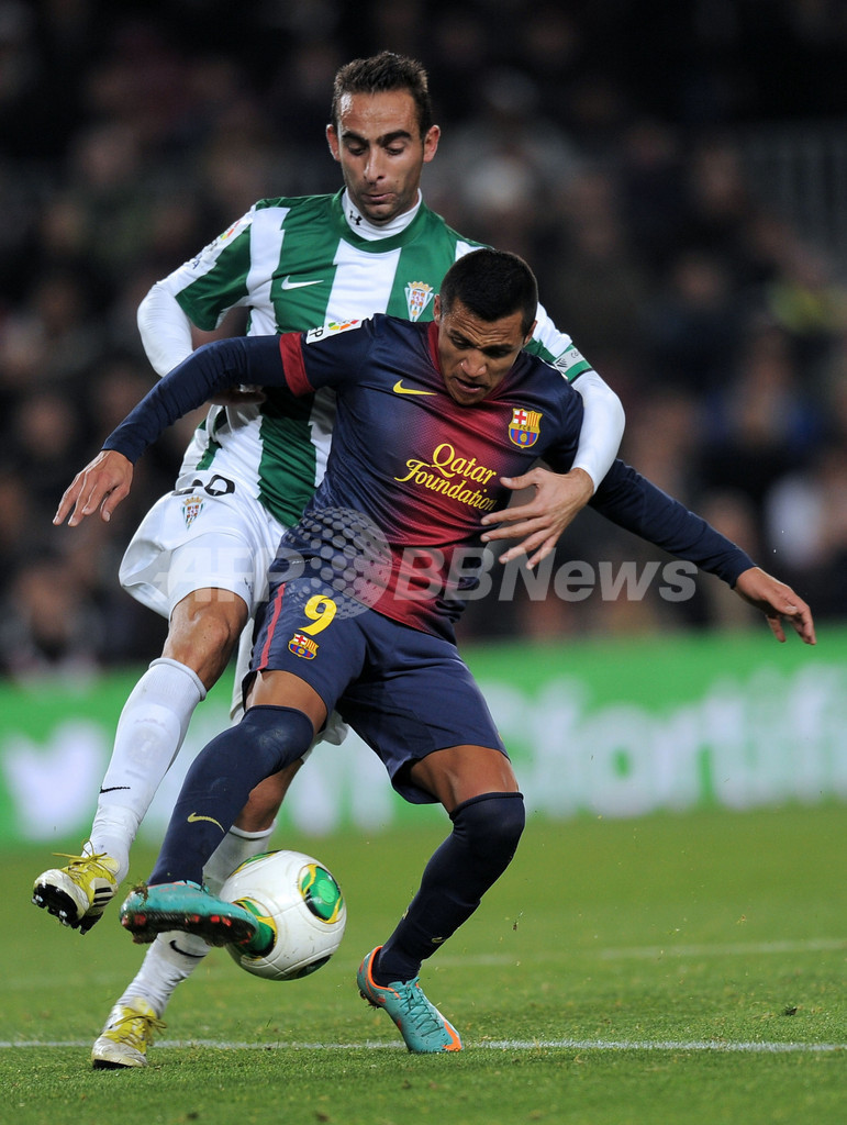 コルドバのアルベルト・アギラル(Alberto Aguila、左)とボールを競るFCバルセロナのアレクシス・サンチェス(Alexis Sanchez、2013年1月10日撮影)。(c)AFP/LLUIS GENE