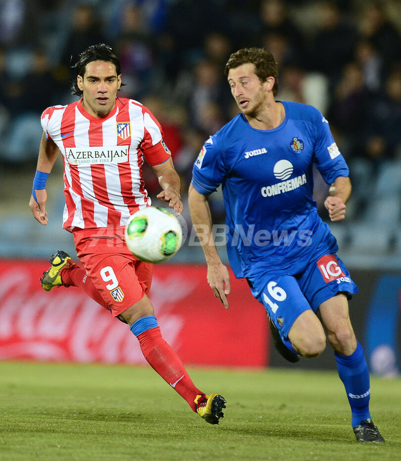 ボールを競るヘタフェのダビド・アブラアム(David Angel Abraham、右)とアトレティコ・マドリードのラダメル・ファルカオ・ガルシア(Radamel Falcao Garcia、2013年1月10日撮影)。(c)AFP/JAVIER SORIANO
