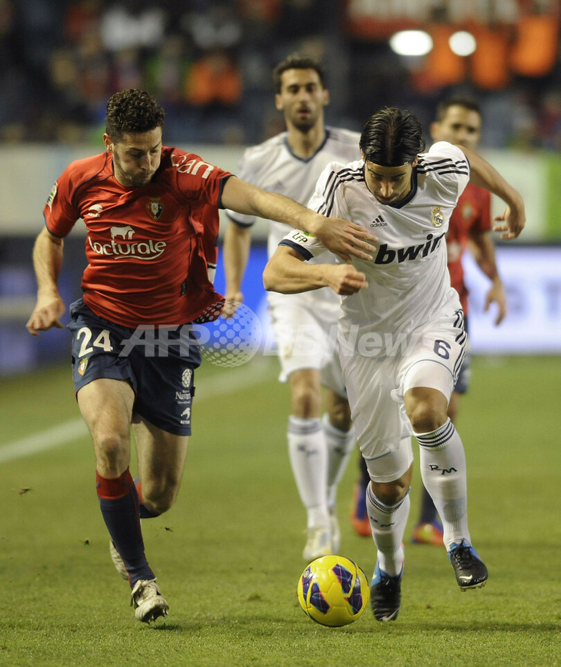 ボールを競るオサスナのダミア(Damia Abella Perez、左)とレアル・マドリードのサミ・ケディラ(Sami Khedira、2013年1月12日撮影)。(c)AFP/ANDER GILLENEA