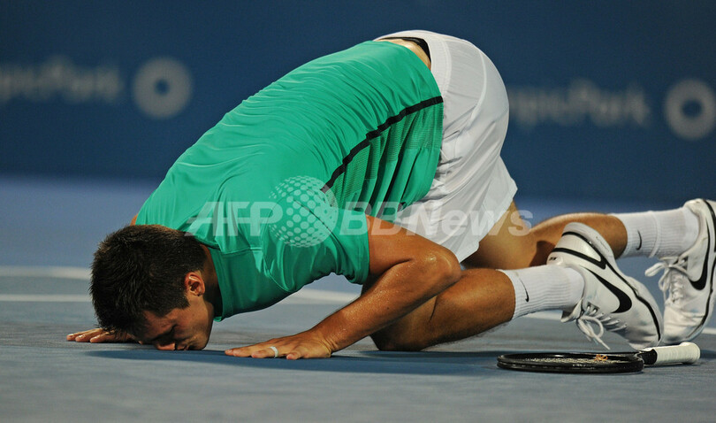 試合後、コートにキスをするバーナード・トミック(2013年1月12日撮影)。(c)AFP/Greg WOOD
