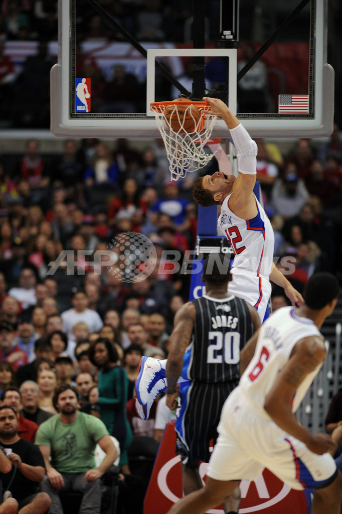 リバースダンクを決めるロサンゼルス・クリッパーズのブレイク・グリフィン(Blake Griffin、奥、2013年1月12日撮影)。(c)AFP/Getty Images/NBAE/Noah Graham